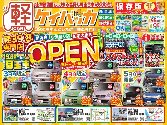 39.8新津店・空港通り店・加治大橋店は3月17日(土)〜4月2日(月)の間、保存版!19.8万円からの日替わり目玉車フェア開催!【期間中ご成約で…】スタッドレスタイヤ&ホイールセットプレゼント☆(各店先着15セット限定☆)【さらに月々払いご利用で…】ドライブレコーダー(取付工賃別)プレゼント☆◆フェア車一例17日(土)はH19ミラ(約7.9万km)が19.8万円、18日(日)はH19ステラ4WD(約7.9万km)が29.8万円、19日(月)はH23ミライース(約6.5万km)が39.8万円おトクにおクルマがご購入できるチャンス♪ぜひお手元に保管ください☆